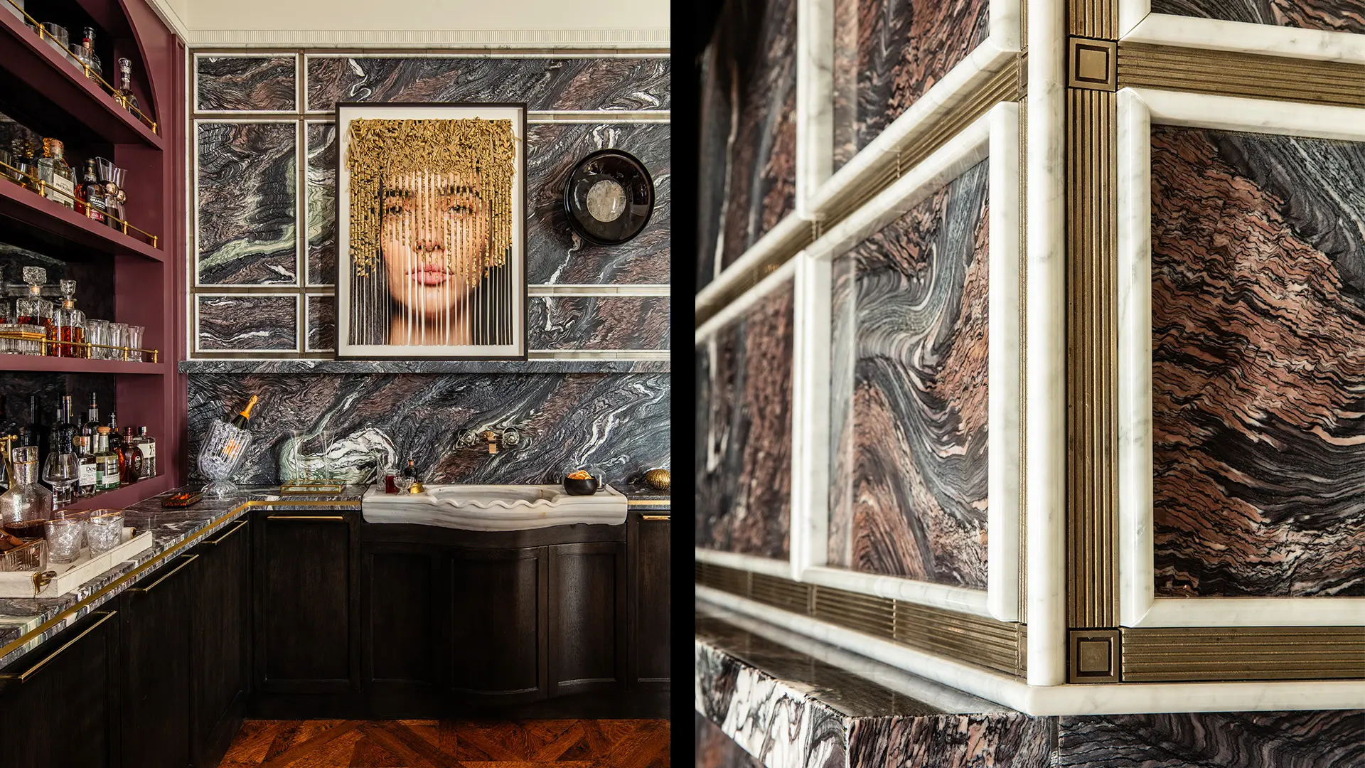 The design build process has been a creative journey, with the team overcoming tight timelines and unique challenges to craft an exquisite environment. Key features include custom-built cabinetry with graceful curved edges and a striking Cipollino Ondulato marble backsplash that adds drama and depth to the room. The seamless integration of lighting—illuminating the cabinetry and reflecting off the marble—enhances the ambiance, guiding guests through the space.