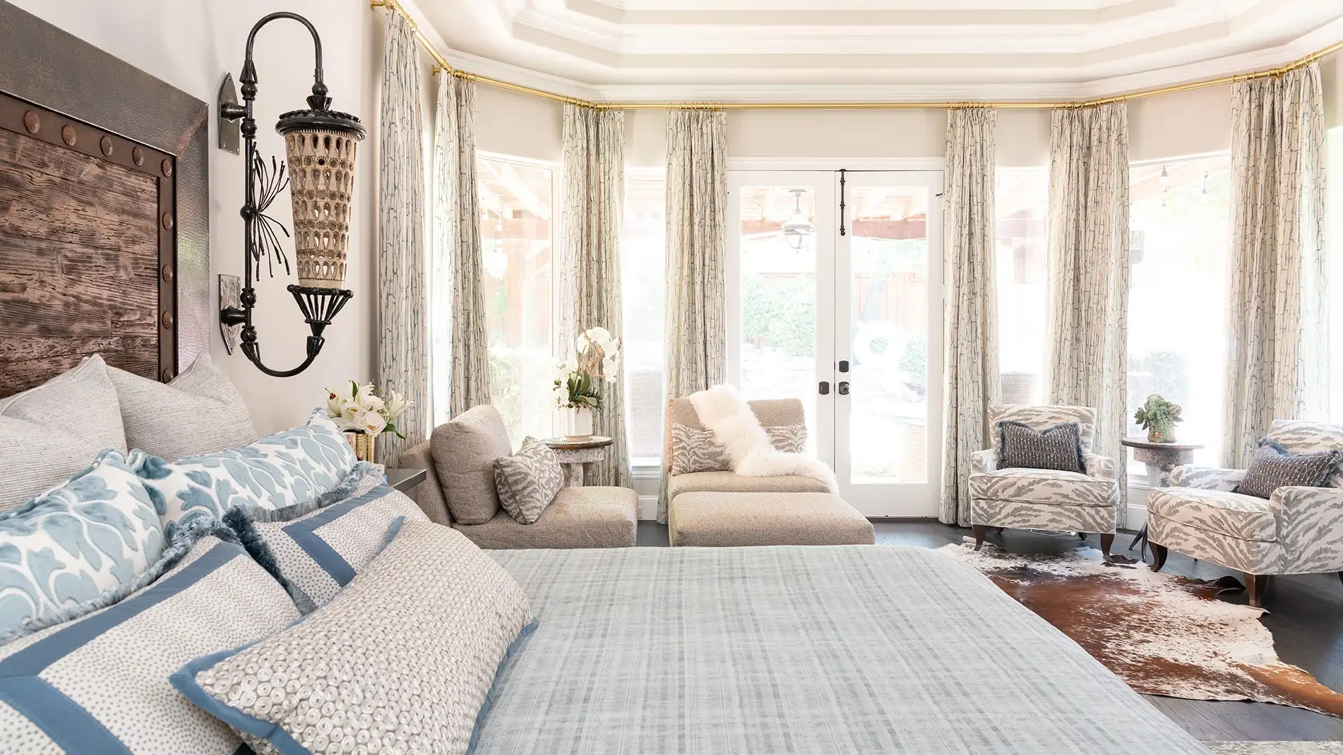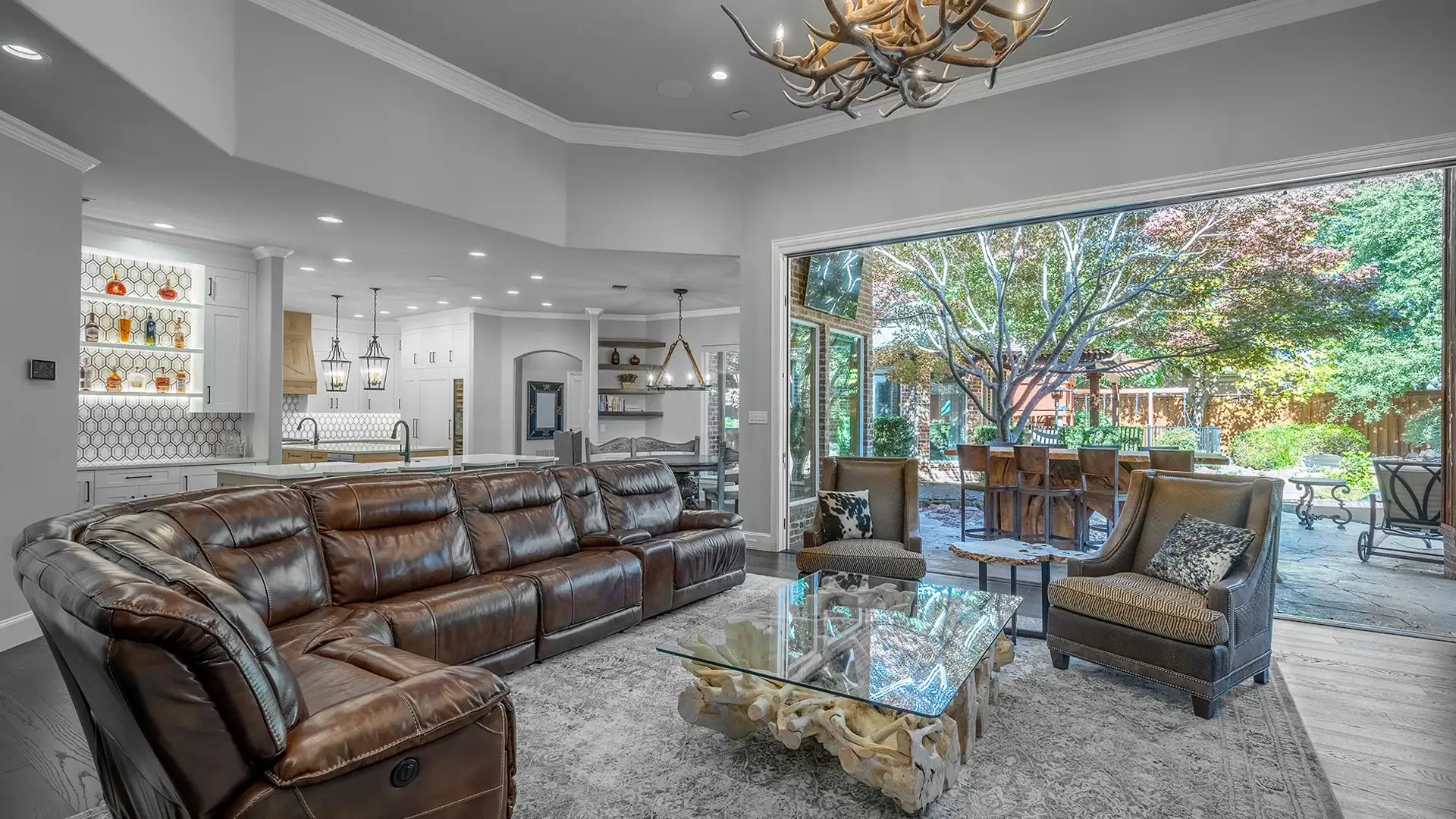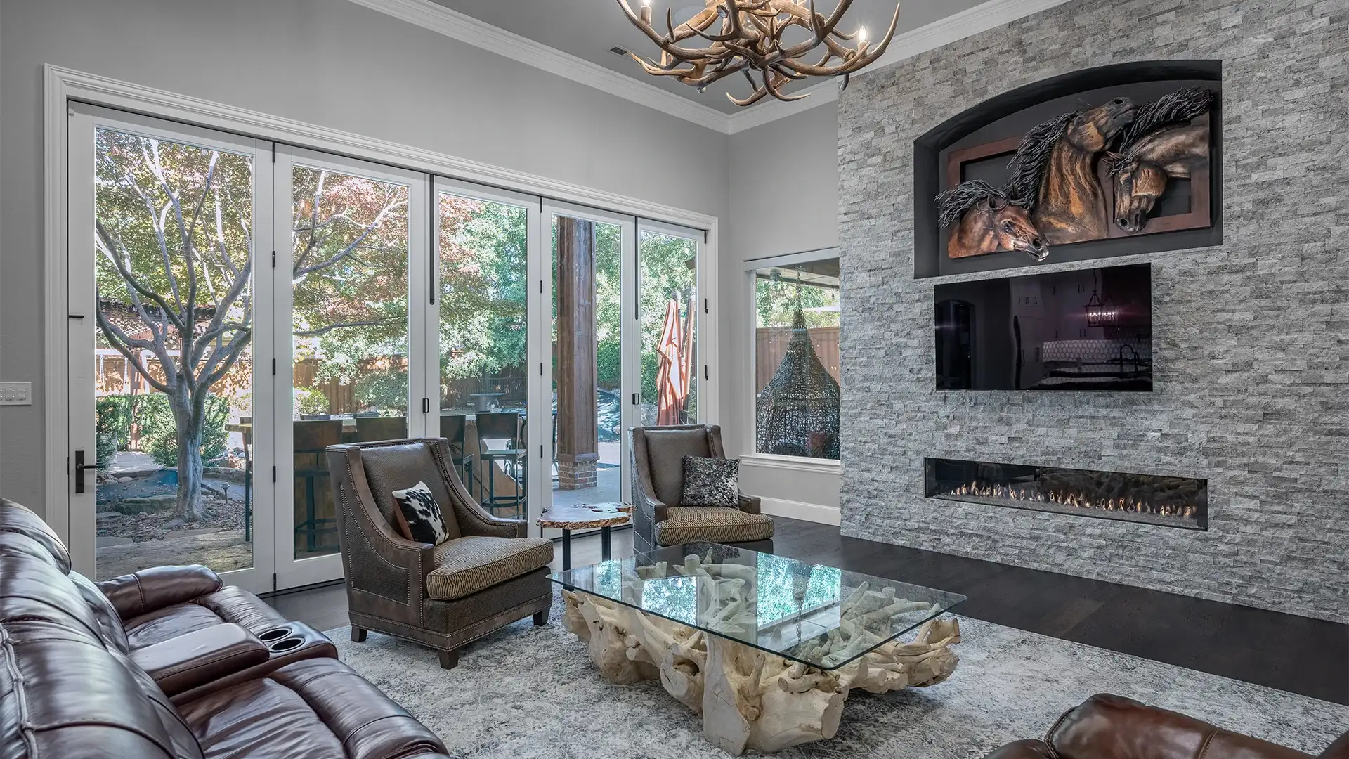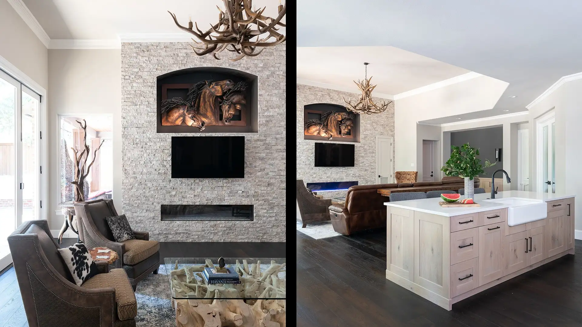 In addition to the kitchen, we renovated the family room. The highlight wall with a 3D copper horse sculpture needed to accommodate its depth, a linear fireplace, and an oversized television. Since the doorway to the AV closet could not be moved, we used stacked stone to create a textural and calming backdrop that balanced everything out.