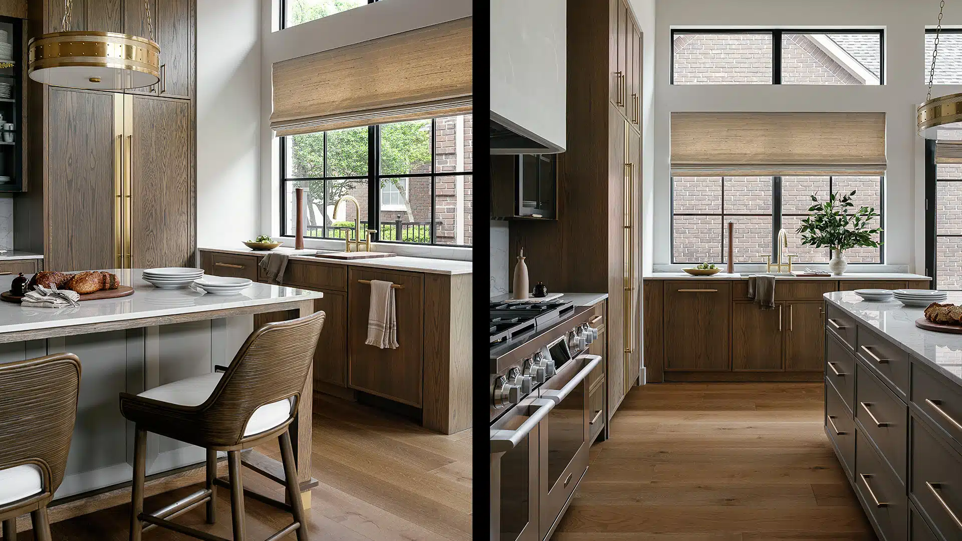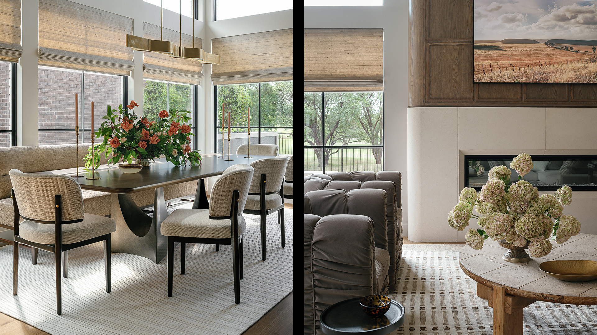 The open-concept living room and kitchen remodel brings in abundant natural light with sweeping views of the adjacent golf course, creating a luminous and airy atmosphere. Custom millwork, cohesive materials, and designer-selected finishes create a fluid aesthetic throughout, complementing the home’s soaring ceilings and architectural details.