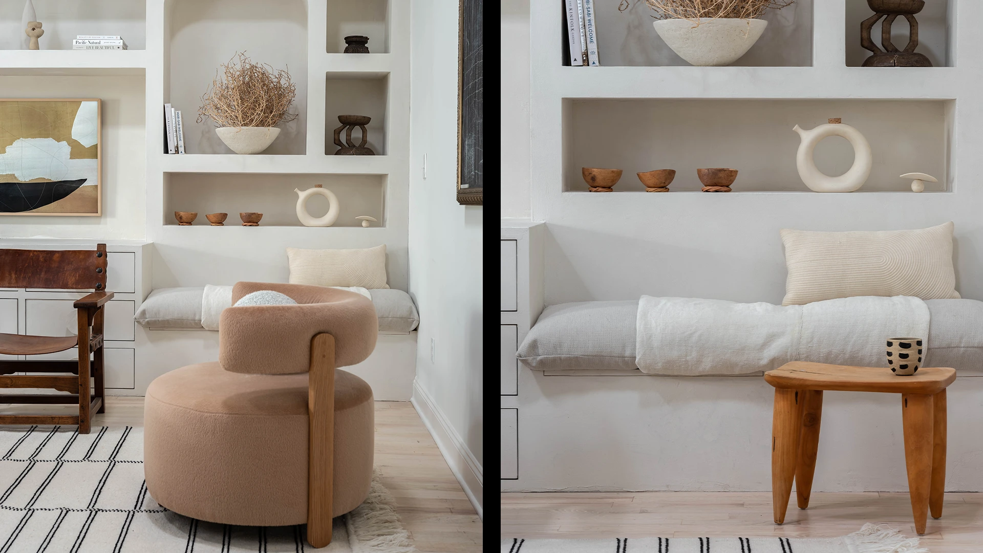 They wanted the space to be open and relaxing, yet functional, with an entertainment center for guests to enjoy. To achieve this, we incorporated light, airy tones with rounded niches to create a seamless flow throughout the space. We used micro-cement to add a tactile quality and a sense of depth. We also built a custom bench for reading and meditating. The end result was a space that felt like a spa retreat, with every detail carefully considered to create a peaceful and rejuvenating experience for the guests.